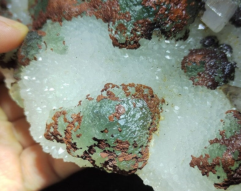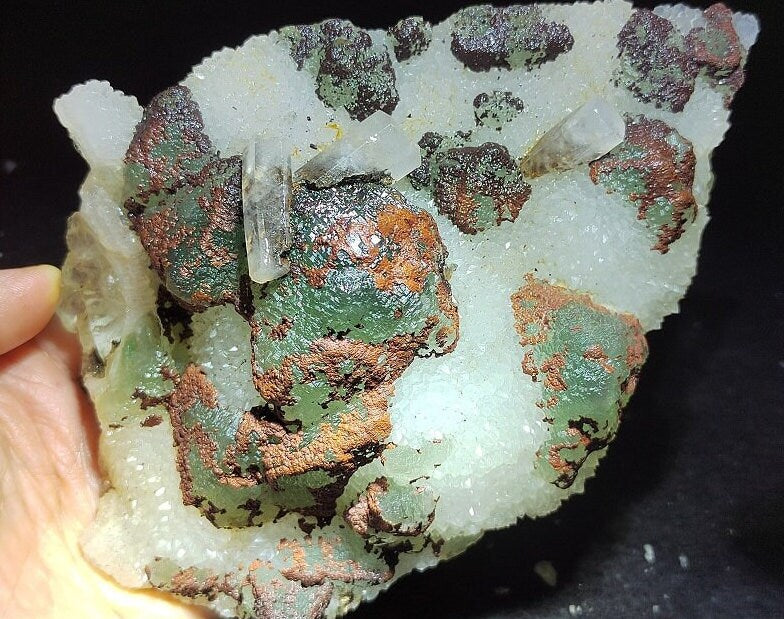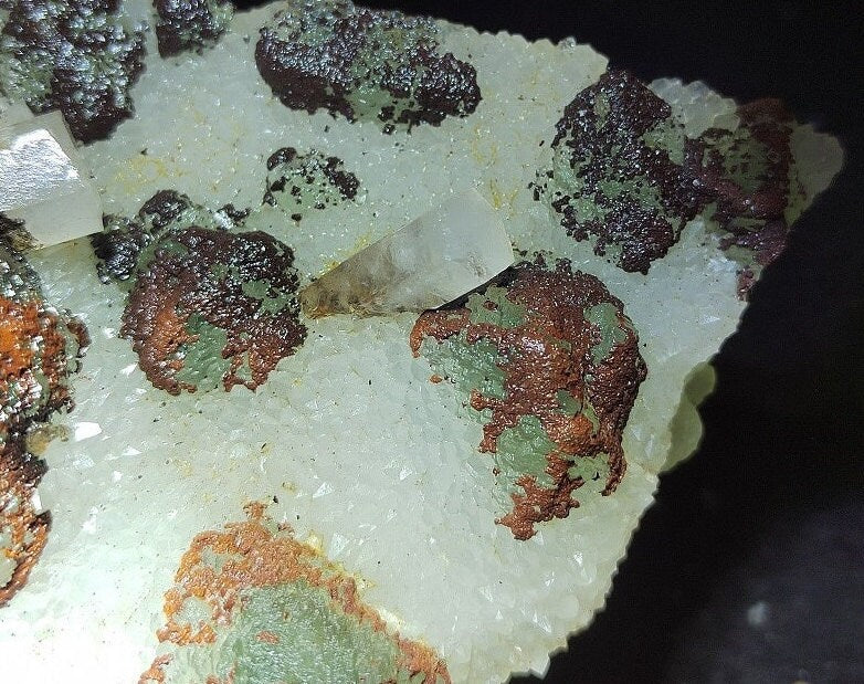 -Columnar Calcite Crystals have grown over base rock matrix that is covered with golden siderite and green chlorite. The calcite is super lustrous and transparent. The chlorite coated siderite looks more like a mound of green moss. It's quite striking with the calcite crystals that have grown through and on top of the siderite.